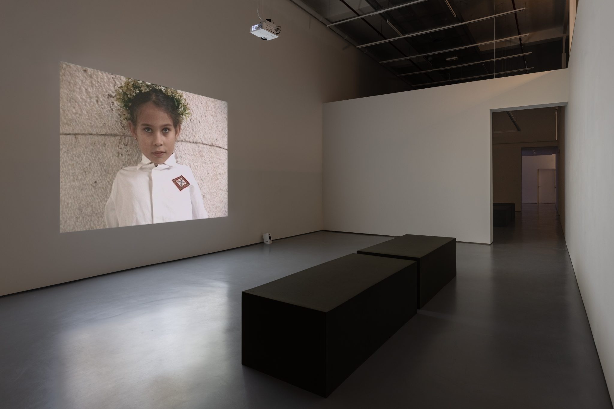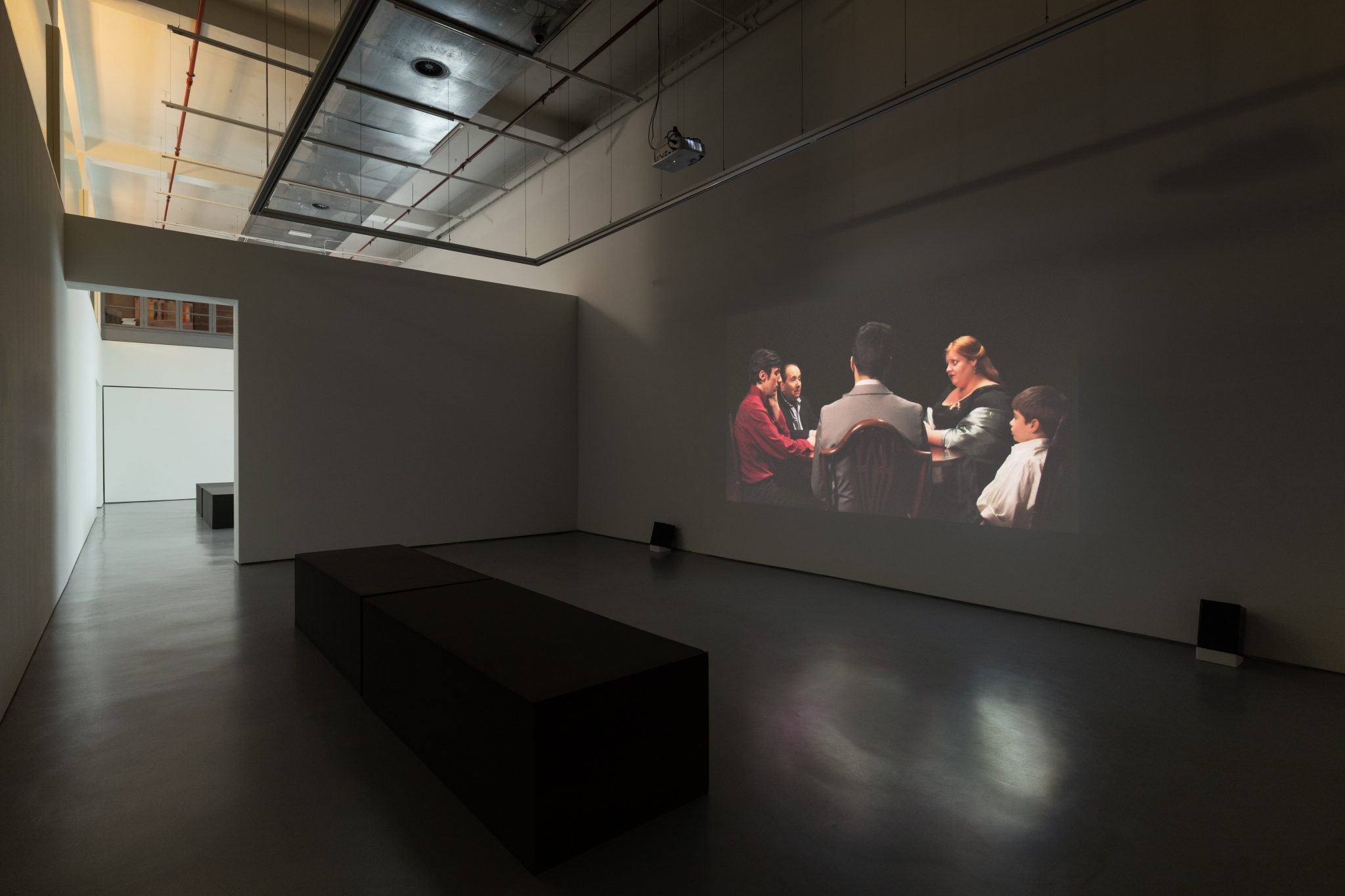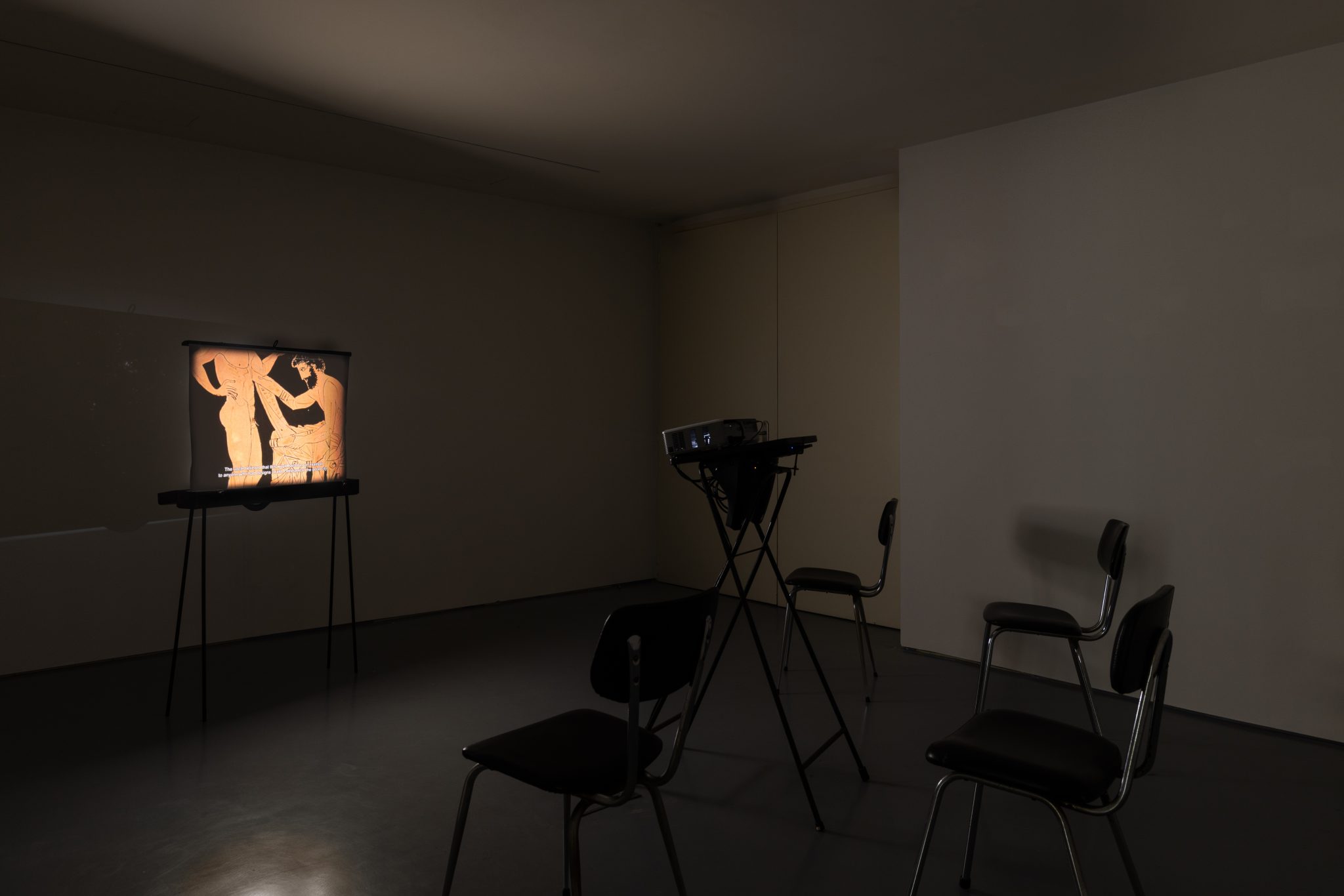 Vídeo, ecrã, mesa de projector, 4 cadeiras / Video, screen, projector table, 4 chairs, Vídeo / Video 16/9, Duração / Duration: 17’39’’, Dimensões Variáveis / Variable dimensions. © Cortesia / Courtesy Galeria Francisco Fino, Lisboa